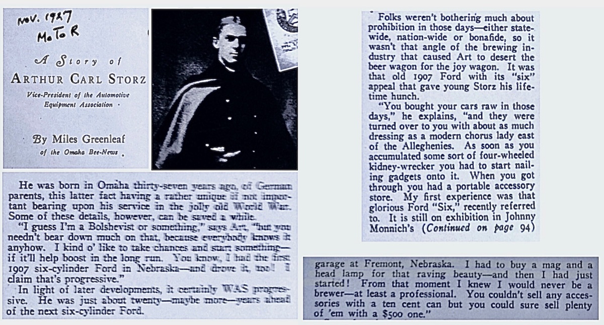 Below, in the November 1927 "Motor" magazine issue, Arthur Storz, one of the Storz Brewing Co. heirs, recalls the "K" roadster as a "raving beauty." By this time, Arthur was a major owner in Western Auto stores: