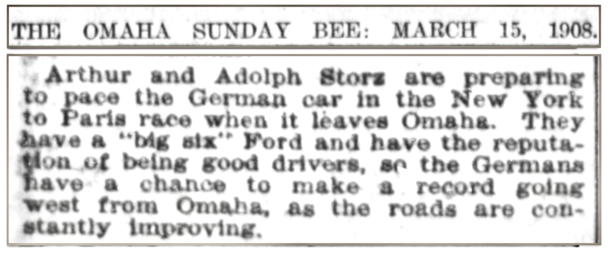 Model K #808 had a few more important events while in Nebraska. The Storz met the German Protos racer in the New York to Paris race in 1908, and piloted it across part of eastern Nebraska: