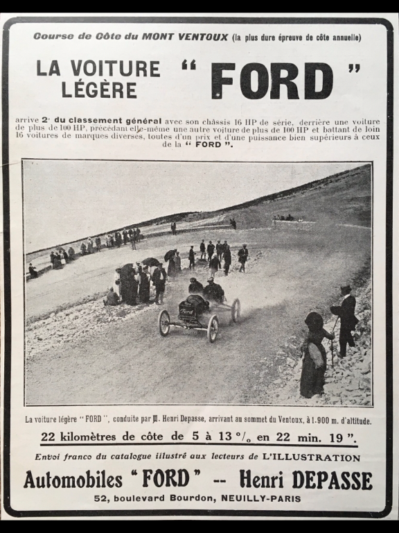 The second, in 1911, when FMC sent a Ford Special to France. French Ford agent Henri Depasse drove the Ford special (just under 3 liter motor) to a 2nd place over finish in the prestigious Mont Ventoux hill climb. The distance and grades on this mountain are almost identical to the Pikes Peak climb: