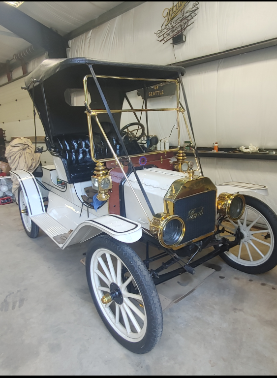 Got her firewall adjusted. I realize the brackets that connect the winahield to the board it rests on are incorrect for 1909, but I am putting her back to her 1960's trophy winning era. Black and white picture is of same care, firewall and windshield. Current paint and condition is from the 1960's. In 1964, Ray Head a fire captain in Chico, California found the 1909 Model T with mother in law seat in Frank W. Boyle's house garage due to a fire. Ray acquired to T from Frank who has purchased the T in 1920 to use with his new wife on their honeymoon. His new wife couldn't resist the cute looking T.