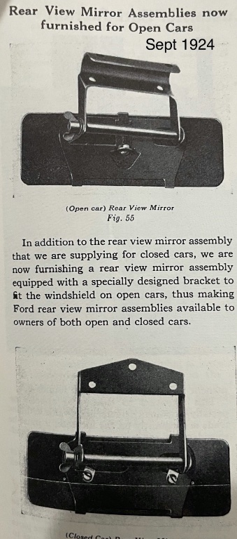 You can purchase new reproductions of the open car mirror that was Ford standard from Sept 1924 to 1927