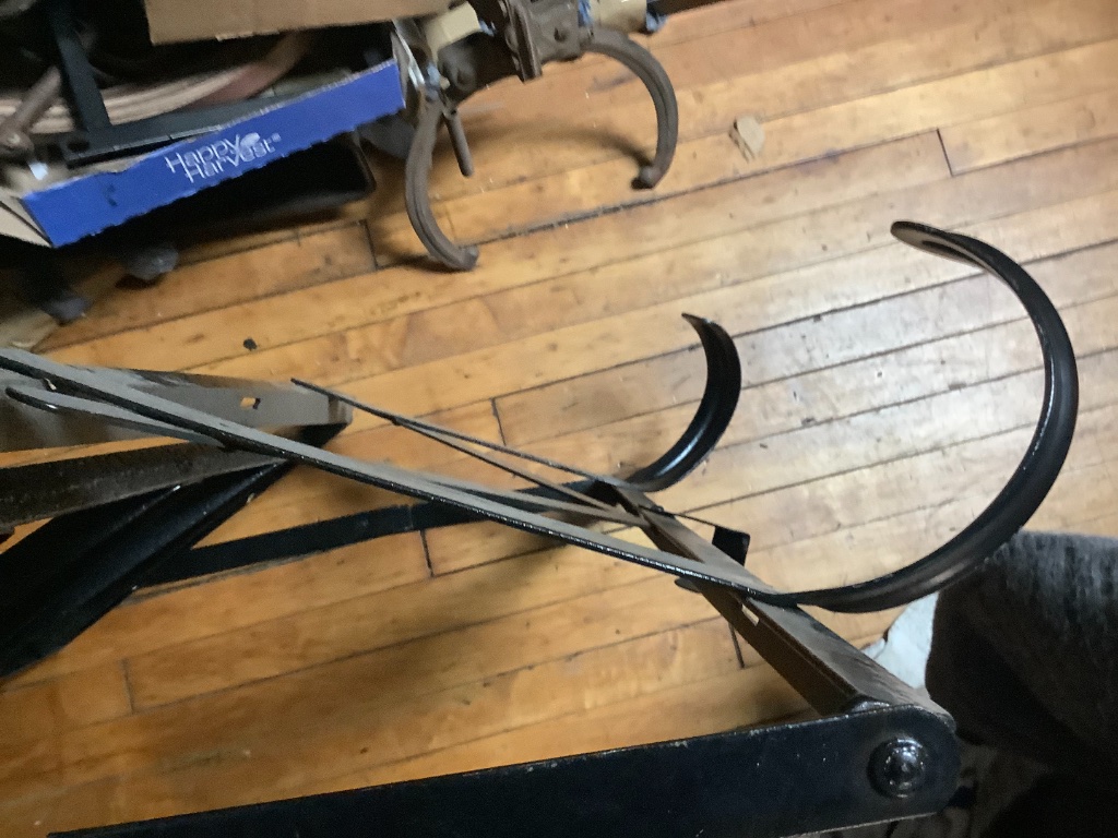 This one is very light, even being steel. Aluminum stock would be even better. I changed the hole to match the angle of my rear spare. Also has an oilcloth covered pasteboard trunk that’s held on with leather straps. Note the latch, the drop arms and also the slots for the leather straps. I’d say a junior high level metal shop project ( if they still had such a thing!) let me know if you want it Tim, and it’ll be on the way.