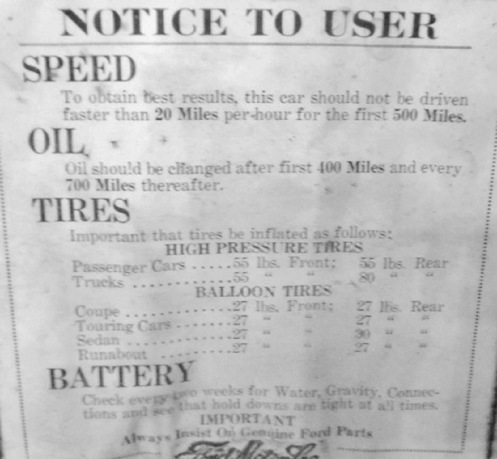 This is from Floyd Clymer's reprint of a Tire and Rim Book. (1915 to 1927) While the new tires are better in many ways than those made in the teens and twenties it serves as a guideline. Note that it says "minimum" inflation.
