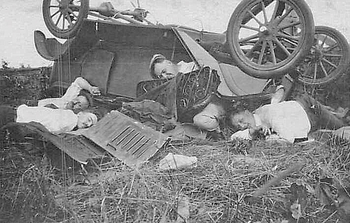 I'm not sure about the accident picture. A couple of the guys still have their hats on. I'd think that would be very unlikely in a real fatal crash. Their white shirts do look suspiciously clean, too. The vertical scratches on the left side of the picture may indicate that it is a single frame cut from a used movie film.