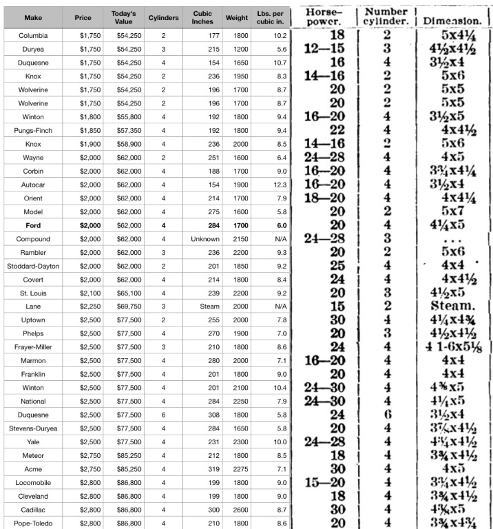 Did it? Below is an excerpt from a "Motor World" list of 1905 automobile specifications, with spreadsheet added. Because horsepower ratings of the day were all over the board, I've added engine displacements. In automobiles costing $1,700 to $3,700, the Ford Model B possessed one of the best weight to displacement ratios among it's peers (click on the attachment to enlarge). A second price column is added, showing what today's dollars equate to the 1905 retail price: