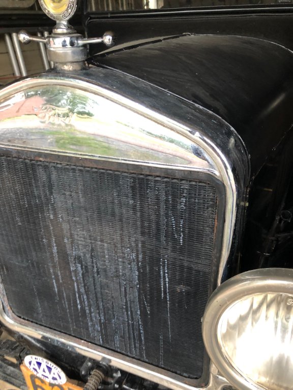 However, this time apparently I did not put the radiator cap on tight enough, and when the motor got hot some of that H2O/Water Glass mixture dribbled down the front of my radiator. I saw it happening, shut everything down, grabbed a bucket, some car wash, and brush and scrubbed away. But I still have white streaks running down my radiator. (Fortunately, I had the hood off of the car.)