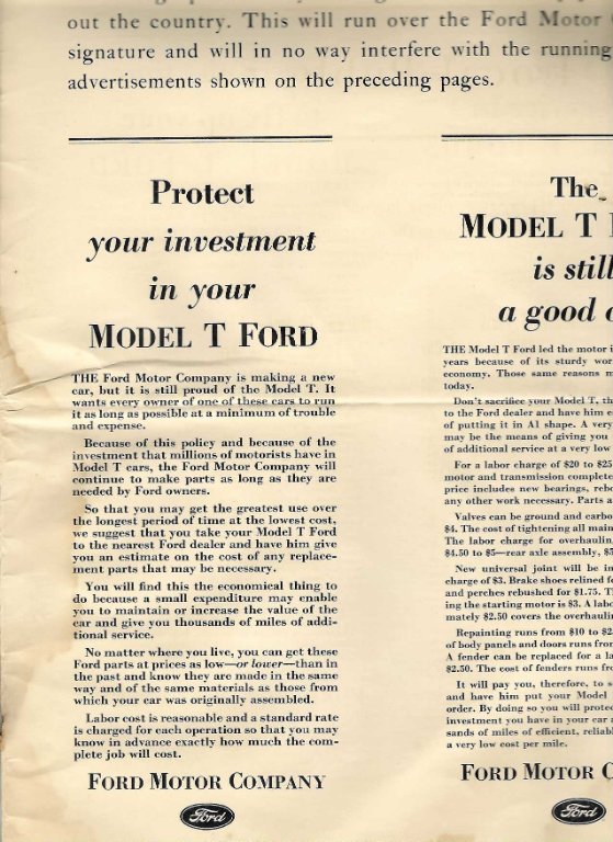 I think they'd have done well to add some copy to the effect that a family's present Model T would make a dependable and low cost "second car" should they choose to purchase a new Model A. A farm family might consider a new Model A, AA, or pickup truck and retain their aging touring car or roadster could serve as a cheap and reliable pickup/second car/ute with an inexpensive mechanical refurbishment. At any rate, reaching out to keep cost concious users in the Ford family was a good idea, especially after October, 1929.