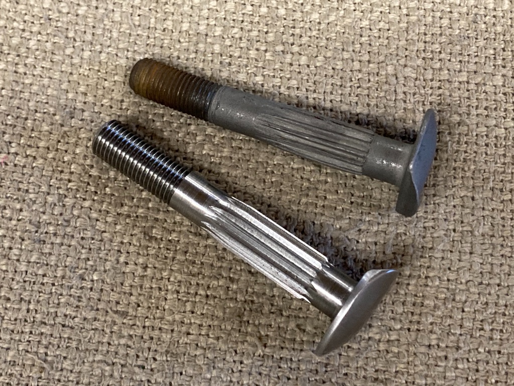 Helping a friend out with the demountable rim bolts on his 15 Hudson touring car. He was missing several rim bolts, and so wanted to make us a couple bolt sets for his 2 cars (6 per wheel). These wheels are wood felloe demountable rim, similar to some accessory wheels made for the Tโs (eg. Firestone). The bolts are heavily splined to press into the wood felloe, and the head is deformed to lay against the rim to prevent turning.