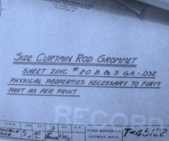 The USA '27 model year also feature that little change. Ford got rid of the zinc curtain opening escutcheon and used its growing metal stamping mfg. to add that molded edge around the hole for the curtain rod. And, if you tried to fit these zinc pieces to the already sheet metal formed 1927 edge, it wouldn't fit. The zinc piece needs the bare edge curtain hole doors, 1926 model year.