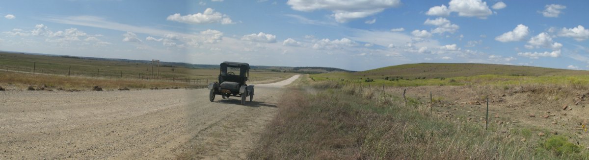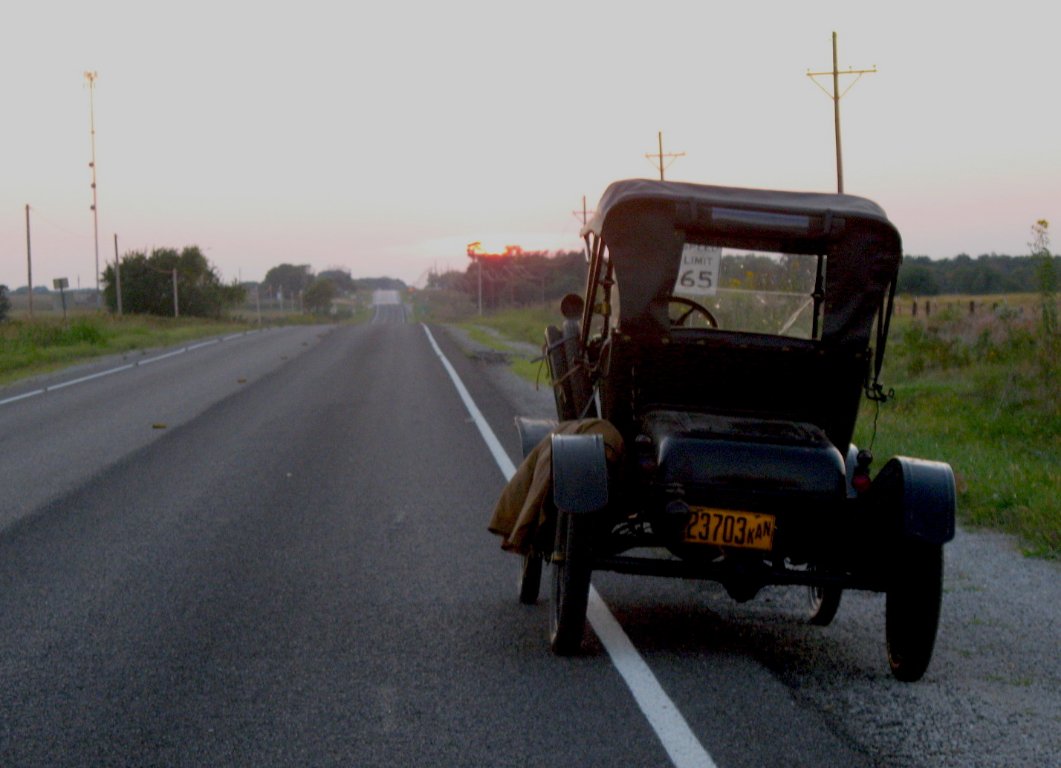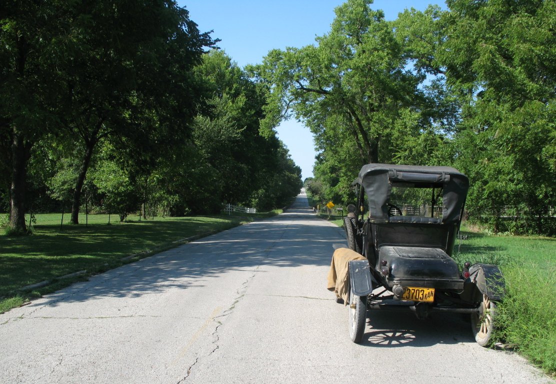 I left home at 7:10 AM Saturday. The 1915 runabout ran great across the first southeast Kansas counties. With the recently installed Holley G I was able to high gear a hill that I previously had to low pedal. But that running great had a serious break when I spent over two hours in the Coffeyville Walmart parking lot reassembling and reinstalling the muffler. That was the second time I've had that problem, and it will be the last. When I get home the muffler will get welded.