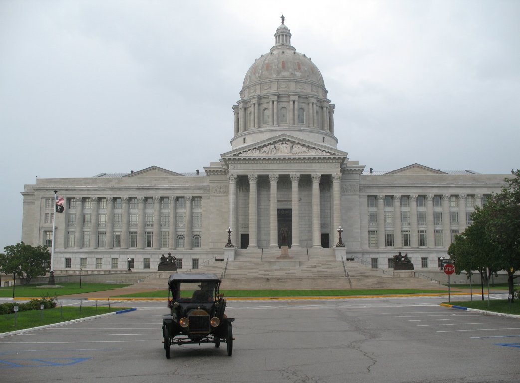 There I met up with Facebook friend Garrett. He rode with me downtown, and we took pictures of my runabout in front of the capitol. Pictures taken, we headed back to the Culver's where Garrett had parked his car. All the way downtown and back the car ran rough and struggled up the hills. I should have known immediately the most likely cause, but somehow this time my previous experiences deserted me. We chowed down and blathered at Culver's. I had always assumed it was coffee shop type of restaurant like a Norm's or a Denny's, but it turns out that the place is just another fast food joint. Anyway, after our visit Garrett led me to the Walmart by a route I hadn't known about before. There we parted ways and I turned my attention to my malfunctioning ride. I opened the hood and found the problem in about two seconds. The #4 spark plug wire was loose and the car had been running on three cylinders. With the latest Model T malfunction solved, I turned my attention to the internet and posted the first On the Road installment above.