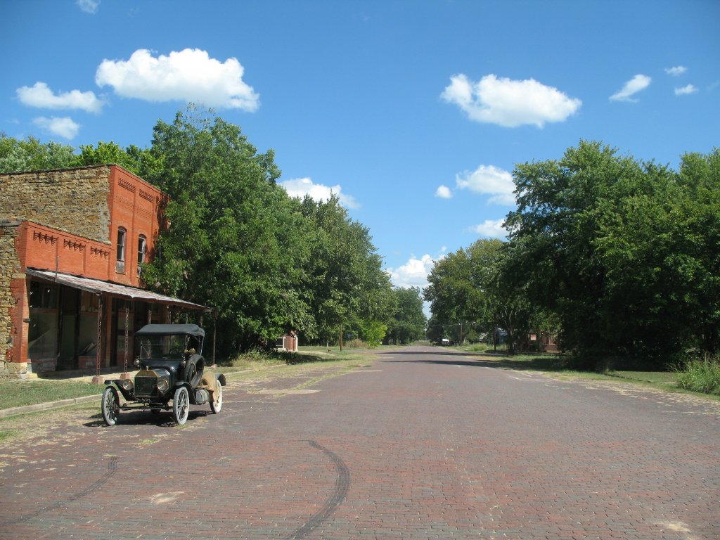 The last 19th century building left standing in Elgin, a cattle town from the days of the herd drives from Texas. The south town boundary was the border of Indian Territory. The decades have erased most of the old Mopac roadbed, but a couple of street crossings are still visible in town. C. M. Scott, first editor of the Arkansas City Daily Traveler, reported on the fate of a horse thief caught near Elgin: