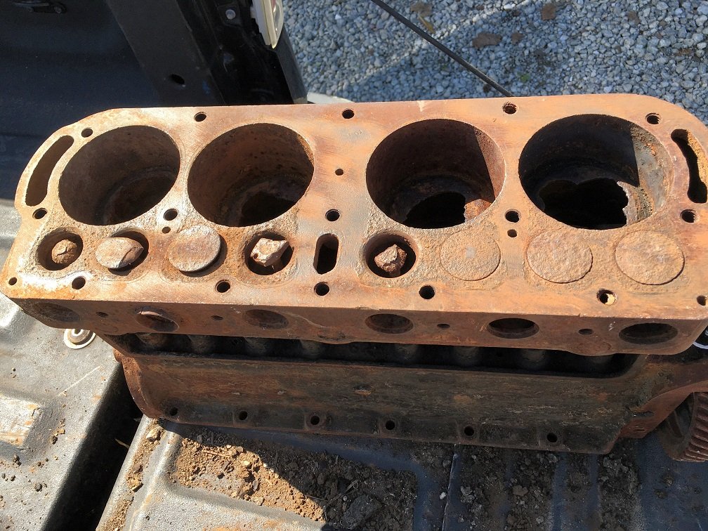 I used a goodly sized metal bar as a punch rod to bang on the pistons from the underside, resting the rod on the piston pin area. If you can eventually get the piston to budge just a bit, you are home free. Just keep squirting penetrating oil around the piston as you bang it up and down to increase its range of movement. As for the valves, first remove the pin holding the spring seat so the valve isn’t held down by the spring. As Joe Bell said punch the valves up from the underside. For the valves having their heads above the surface of block use channel lock pliers to grab the heads and apply a twisting force. Again, if you can get the valve to move using a drift punch and/or the channel locks, then use the oil and go up and down, back the forth to wiggle the valve out.
