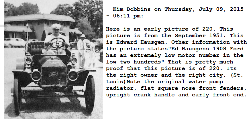 Your quotes from Kim state that the rear seat was missing, not "the body". Most people are aware of and accept this, including the current owner. Where has anyone stated that 220 is "original"? You have repeatedly bashed this car. Not sure what you've got against it. Kim has also stated elsewhere, that 220 is one of the most complete 2 lever cars still in existence**.
