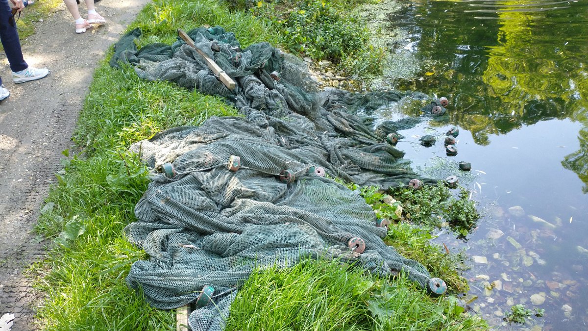 The eggs are placed in these tanks to grow into fry. They use nets like this to move fish from pond to pond. Here is the high quality fish food that they throw out over the water. This garbage can is filled every 3 days. The mass frenzy as they throw the food out over the water.