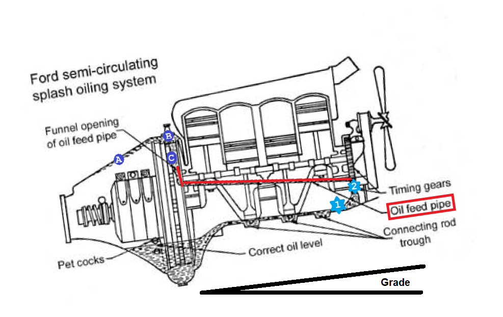 One thing to consider with the Ford system is that when the car is headed up a steep slope, the oil level in the sump area will likely increase due to oil running back to the sump faster. More oil in the sump would mimic having a higher oil level in the engine and tend to offset the effects of having to push the oil uphill to the front of the engine by tending to keep the flywheel well supplied with oil to fling. I'd still want to keep the oil level toward the upper limit in hilly country. I believe some type of auxilliary oiler is a good thing to have, if only to prevent damage in the event the standard oil line became restricted. I also believe that oiling would be improved in cold start situations, too, with more rapid and plentiful oil delivery to the troughs and timing gears, and thus to the entire engine.