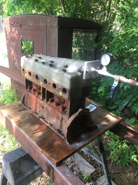 I have put this up before but thought it could use a reboot. All T blocks that come here for work are first given a pressure test. I made tooling and bolt down a head with a reusable rubber gasket. Then the whole thing is filled with water and pressurized to 20 psi with a radiator pressure tester. More than a few times I have found leaks that would only have come up after I built an engine and a customer put water in it. Not a phone call I want to get.