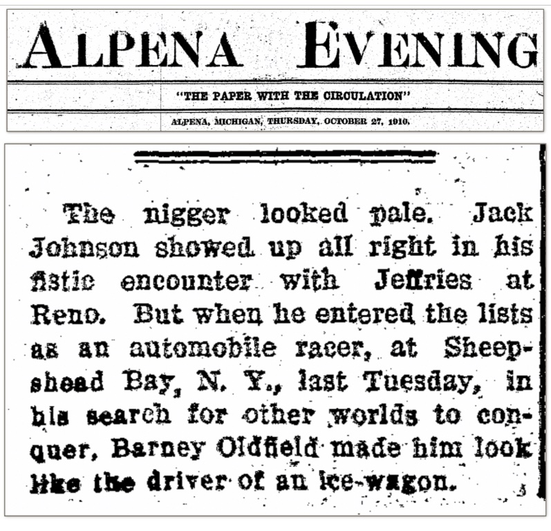Below: Jack Johnson at the wheel of his Locomobile at the time of his race with Oldfield. He doesn't appear "pale" as the last article described him regarding his competition with Oldfield: