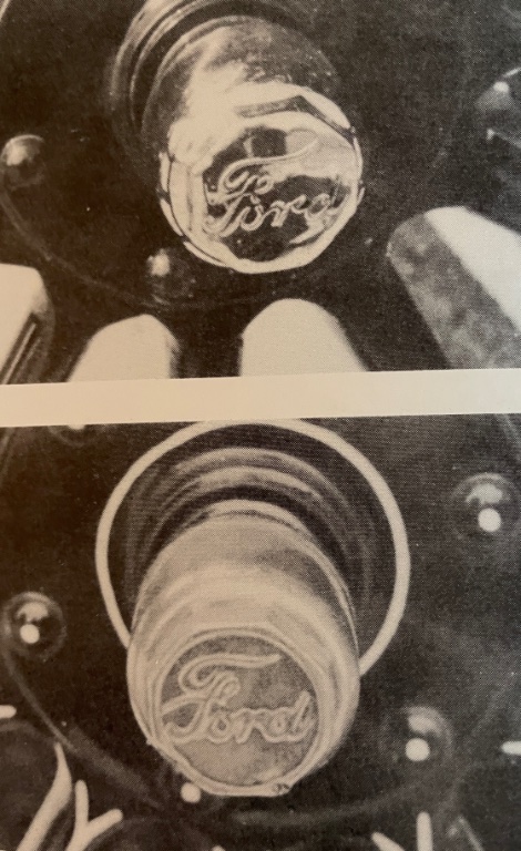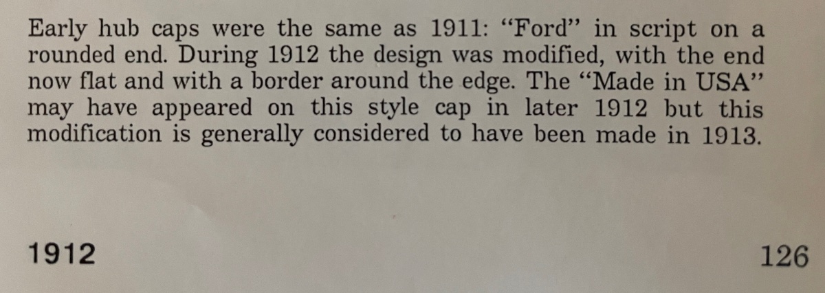 When I posted the picture of my style hub cap I considered it similar to the description in Bruce W. McCalley's book, 'Model T Ford'. I am including a photo of the paragraph from his book, page 126 and picture of the two hub caps he described. If I am infringing on a copy right by posting those pictures I will gladly take them down. Now if someone has an update on his research on the hub caps please enlighten me. My car is Canadian and there are even less production records surviving, and no, I didn't pick the car up new.