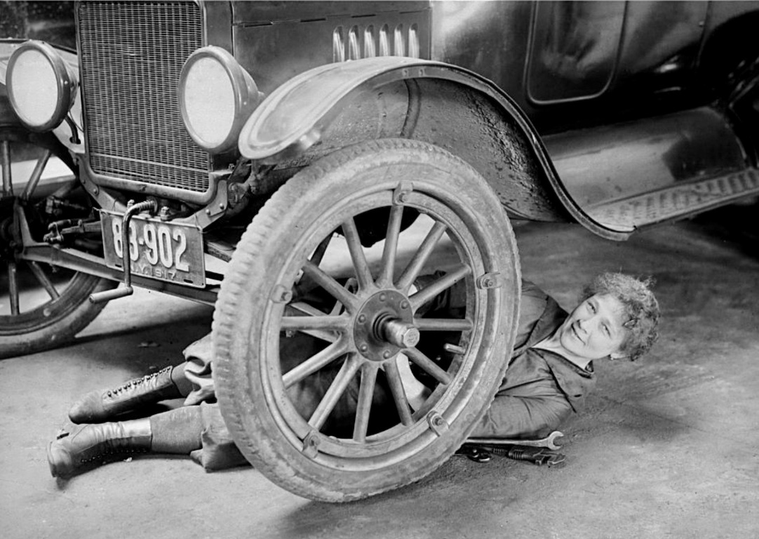 Interesting picture with the woman “supposedly” working under the T. Looks like there is a spark plug wrench and adjustable wrench. Next to her. Wonder why she’s using a plug wrench under the car??