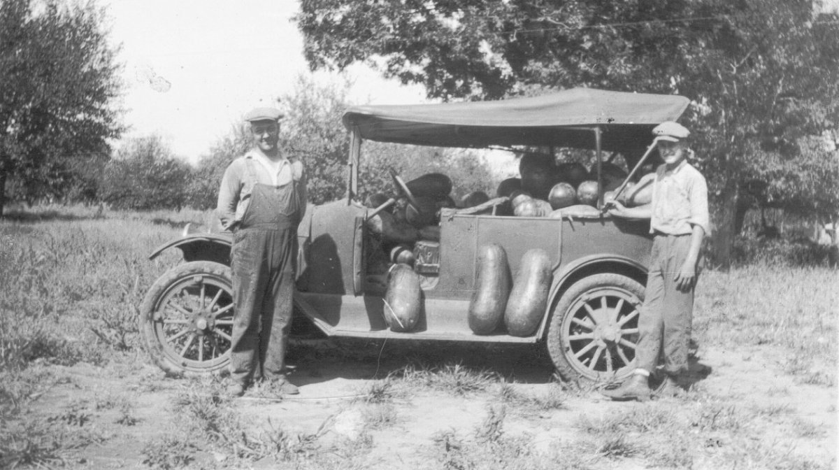 Uncle Lester Parker with his stepson Herman Roach about to take their crop to town in the old Chev.