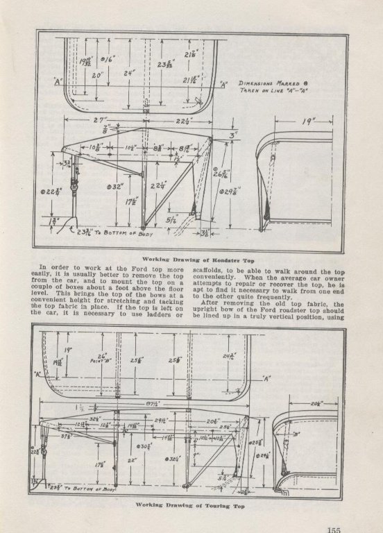 What Ken says seems to be very good idea. If you have existing side curtains, be sure they will fit correctly. Also the overhang on the windshield is determined by the pillars and the brackets on the front bow. An important thing about the rear bow is that it be the same distance above the back of the body on each side so it will look straight regardless of which way the frame might sag of lean while driving. Also check the fit of the rear panel before you trim anything.