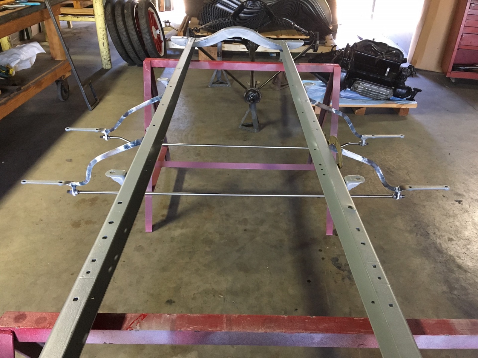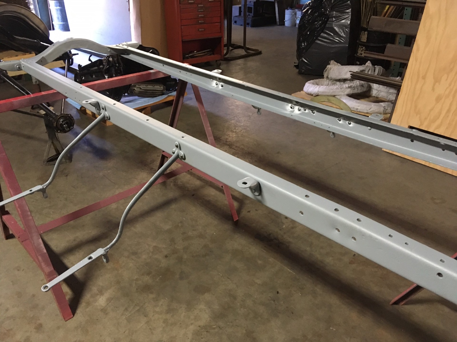 It’s been too hot to paint, so I took a little side job this past week. Started with a bare frame, running board brackets and a speedster kit a customer wanted setup. After sandblasting the frame and brackets we riveted everything in place. Of course they are bent and twisted, so I made a jig using John Regans frame and bracket dimensions. It’s 1” box tube with two studs out the bottom to locate the r/b holes. There are two stops on the top bar to separate the rails 20”.You clamp it to the top of the rails and heat the bracket and move it until you can place a clamp and draw it on to the studs. Do each one and you have brackets that are in the same location to the frame.