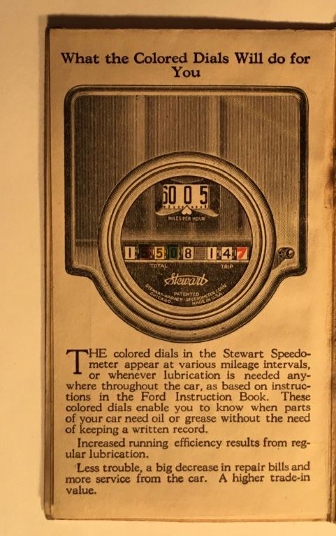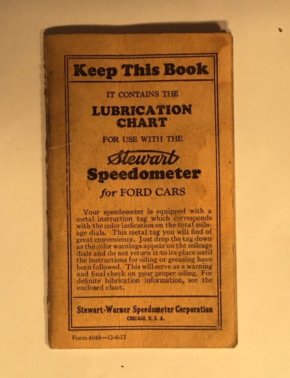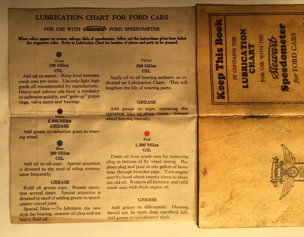 Possibly one of the rarest speedometer items I have run across is the lubrication tag that came with the Stewart Model 160 speedometer kit. The tag provided the owner the information necessary to properly maintain his Ford when a colored odometer dial came into view and was kept out of sight by a spring attached to the speedometer. Unfortunately, as Will found out, the pot metal odometer dials swell, making the speedometer unserviceable, but the booklet that Jim has provided in this thread and the lubrication tag are of great interest when installing a Stewart speedometer. I have only seen two of these tags.