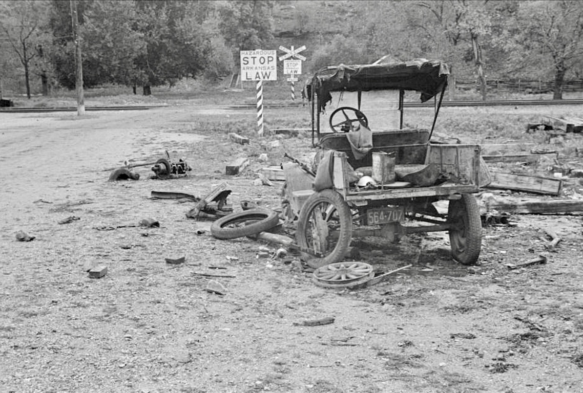 I do not think the T was hit by a train or any thing. Ts were often just left where they stopped running. Others would remove parts as needed. I have seen other photos of similar situations. The old story was that if you needed a part for your T, just walk down the road a ways.