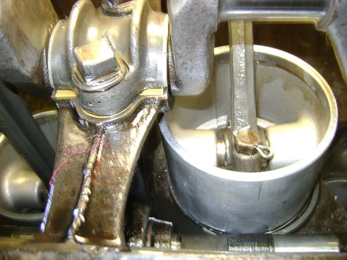 Thank you, gentlemen, for your comments. I may try to pull the rod through the bottom. If it doesn't work, I'll pull the head. The crank looks pristine, measuring 1.235, so it must have had a regrind when overhauled 15 years ago. Since all the other rods look good, I assumed the problem was my not pouring half a quart of oil in the front to put oil in the dips before the stock internal line, mag post filler, and Horlick style filler on the hogshead could get oil there.