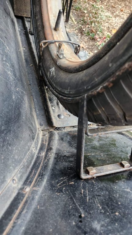 When I first got Henrietta the spare was carried loose on the tray. I fashioned this carrier, based on an original blacksmith made item on my 1920 backboard. I offset the cradle forwards. picked up the fender and running board bolts for the mountings. And screwed a couple of footman loops to the tray for the rear strap. All done with used materials some 4 years ago.