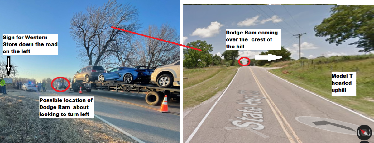 WOW layout of accident scene looks like a spot to avoid. Assumptions: If the Dodge Ram driver was looking for the Western Store, slighted distracted, coming over the hill (look at the photo on the left) and no way to see on coming traffic until..... may have started a country turn too