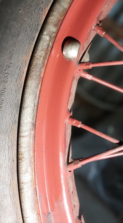 This is a non-Hayes fixed lug rim on a Hayes felloe. Note the lug stands off the outside face of the felloe just as the Hayes lug does. The rim wedges on the inside land of the felloe as it should. The take home message is fixed lug rims fit on the felloe in the same way, but a zHaues rim needs the relief in the felloe for the foot on the lug.