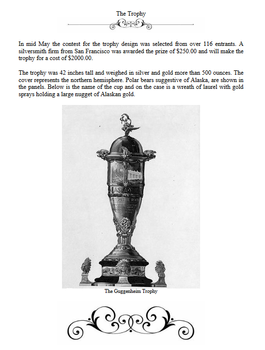 On display after the race was over. Note the Guggenheim trophy, 42" tall, with $2000 worth of Yukon gold nuggets with total cost to build of $3500 (1909) that is over $100,000 today! And the whereabouts of it are unknown.