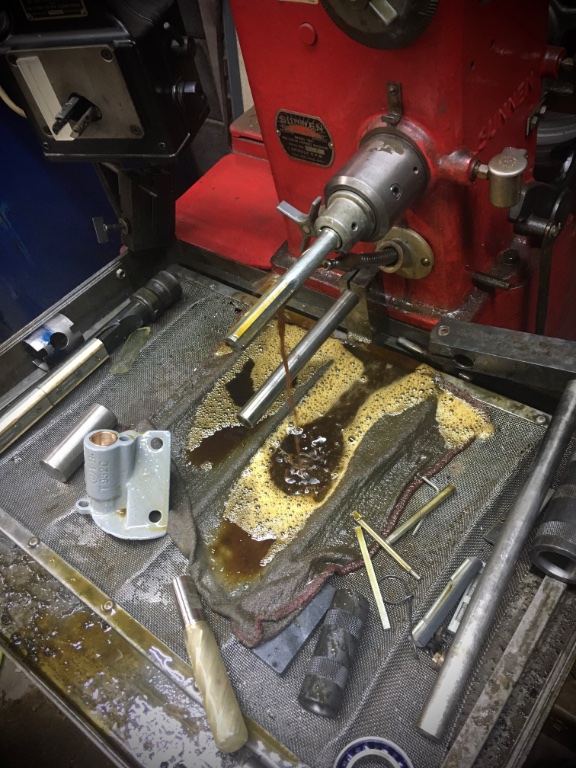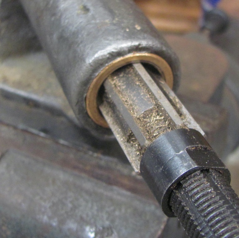 Without a machine shop, home garage tool is the trusty adj. hand reamer does good work to ream the soft brass bushing for a good fit.
