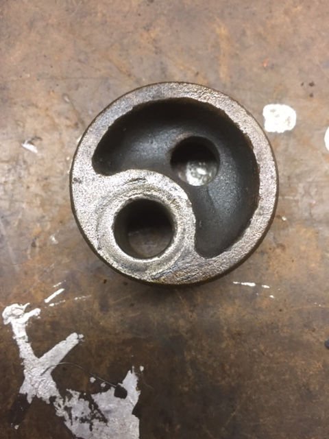 This is an early 26 fan bracket and eccentric part, notice the hole in the "quarter moon" shaped cavity that is for the locating pin? Since the hole is quite a bit larger than the one on the place I'm assuming that, that hole is probably threaded and has a reduced shank for the pin hole on the plate.