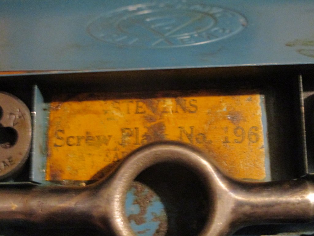 I found a nice Stevens Tool tap and die set a few weeks ago. It is in the steel "embossed" toolbox. All but one of the dies are stamped with the "Stevens" logo. It is a small box, 5/8 X 4 X 9 inches in size Nearly all of the "Stevens" toolboxes I have seen are painted the blue color of this box. I do not find many Stevens tools that I do not have so these little boxes make for a nice addition to the collection. Please post pics of your Stevens boxes if you have any. I always enjoy photos of other Stevens tools and boxes