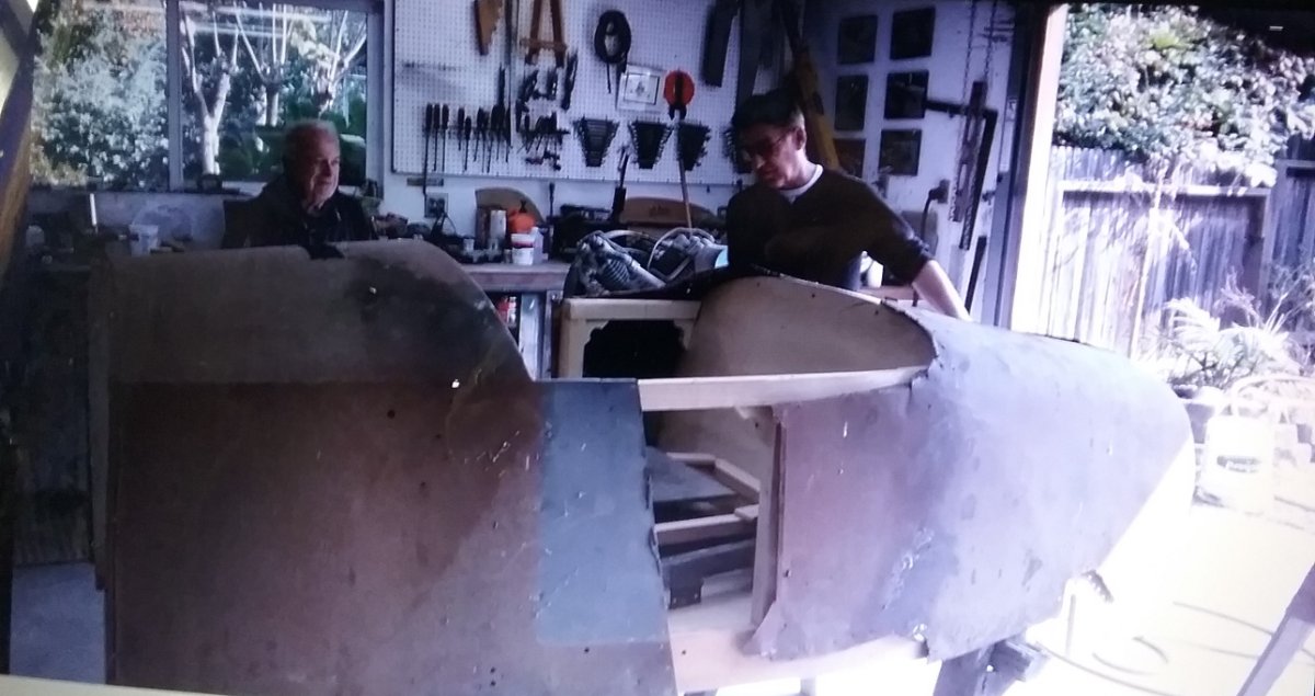 Response to Tim and Ron. Couple of pictures. Original speedster, not a race car. At this point the chassis is done, waiting, waiting, waiting on the body, a lot of wood rot, it was rough. In the pic. of the body L to R Chad Knickerbocker, the wood guy, and chief sheet metal and all around body advisor Dan Erceg. Don't let the lighting fool you, it's not a boat tail.
