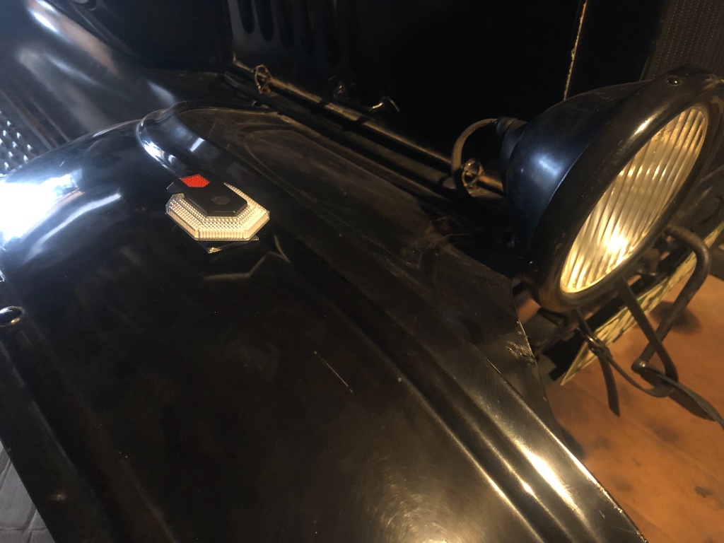 I consider my fling with magnetic tail lights a failed experiment. I drive on country roads a lot and had to resort to welding rod hooks and rubber bungees to keep them in place. That worked for one driving season, but the next year one of them shook to pieces. I had to decide: show car, or driver? The decision was definitely driver. So I made rear mounting hardware sturdy enough to survive, I hoped, and held in place by wing nuts for easy removal if I want. For tail/brake lights I used Model T electric tail lights, and truck running lights (or motorcycle tail lights?) for turn signals.