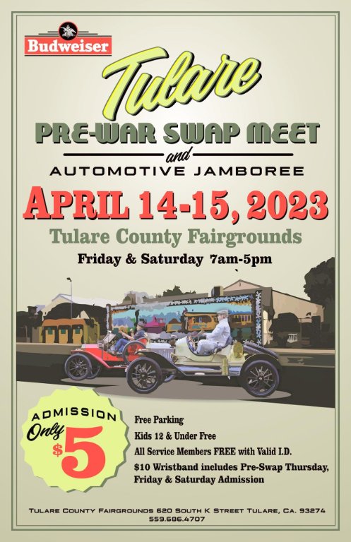 Fear Not!! Tulare 2023 will be a GO!!! Steven Chase and I have been working hard to make this event even better than last year. There have been quite a few changes happening and I'll explain in detail a little later. At this point, Tulare is going to be held at the Tulare County Fair Grounds in Tulare. The Board of Directors at The International Ag Center decided not to continue with their Swap-O-Rama and, thus, cancelled the Pre-War/Brass-Era swap meet as well. The 2023 edition of Tulare will closely resemble the "traditional" Bakersfield Swap Meet. It will be a Pre-War/Brass-Era ONLY event. The details are still being worked on. We are planning on having vendor move-in on Thursday afternoon with the swap meet available through about noon on Sunday, or, until everybody "bugs-out". I'll be in contact with many of the vendors and hopefully we can have a very successful event next April. Tentative dates will be April 13 through 16. Again, I'll post more details soon so we can all make plans to attend this premier West Coast Pre-War/Brass-Era event. I hope to see many of you in Tulare next April. With Kind Regards, Bill Bennett