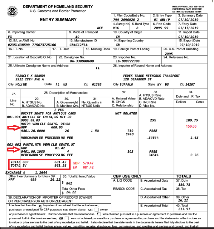 The Commercial Invoice stated a non existent currency code UKL instead of USD. Then FedEx assumed it was GBP when filling out the Import Declaration it took me a full year for FedEx to understand their error and refund me the difference. I was told that the $800 de minimis threshold didn't apply because the Country of Origin was China. Not sure if that was true but the person who finally got me my refund seemed to know what was correct. Doesn't matter and no further discussion need on it. Just need to understand Blockley Imports