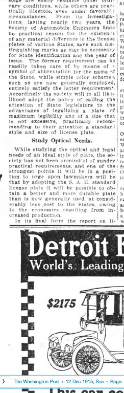 This article from December 1915 describes how standardization committees were moving towards establishing standards for both license plates and mounts, which would in theory be adopted by all domestic manufacturers. They wanted plates to be simple to put on, held securely, clearly visible and illuminated, and easily read, regardless of state, and that this would come into use by 1917 or so.
