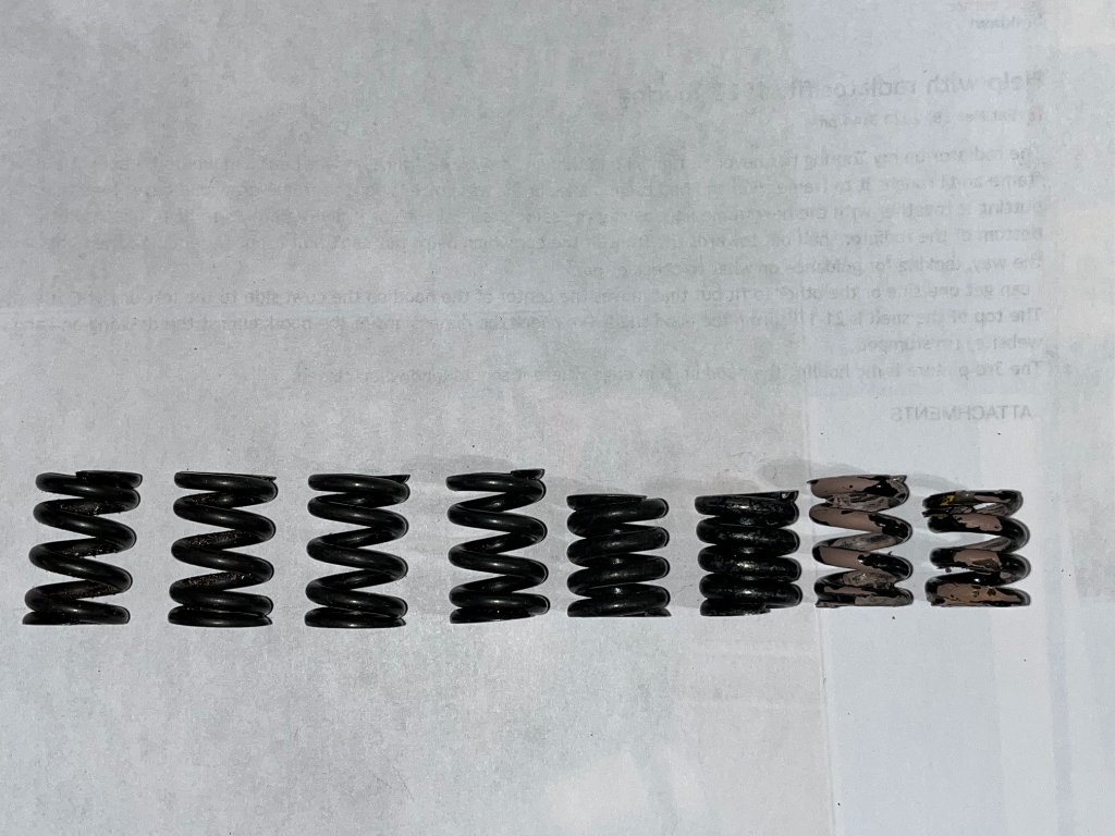 The issue about the new springs started out about stiffness & then were compared to some old ones. From that discussion the picture was presented with the two new springs of equal length & two old springs on unequal length. Then length was to resolve the stiffness issue. Now how can we account for the old springs, one slightly shorter than the other? Is one broken, metal fatigue other?