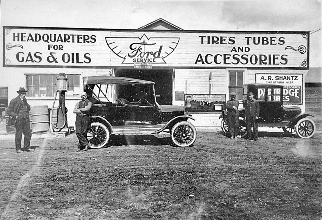 One of the first was the ninth photo with a service station and accessories dealer behind the two Ts. What caught my eye was the "scarab/pyramid" "Ford" logo painted on the face of the building above the cars. Ford officially used that logo for only a short time during the brass era, however, it unofficially hung around for quite a bit longer. So seeing it prominently displayed in an apparent 1920s photo was very much interesting. The immediate question became how well into the 1920s was it? At quick glance, the slanted windshield and two man top would indicate 1923 or later. But some questions caught my attention also, so I looked closer. And there in the signage, was the answer. "Carstairs Alta" is a small town a bit North of Calgary Alberta Canada! The Ts are Canadian models. The Canadian tourers got the two man tops and slanted windshields nearly three years earlier than did the USA built model Ts! So that "touring car" could be as early as a 1920!