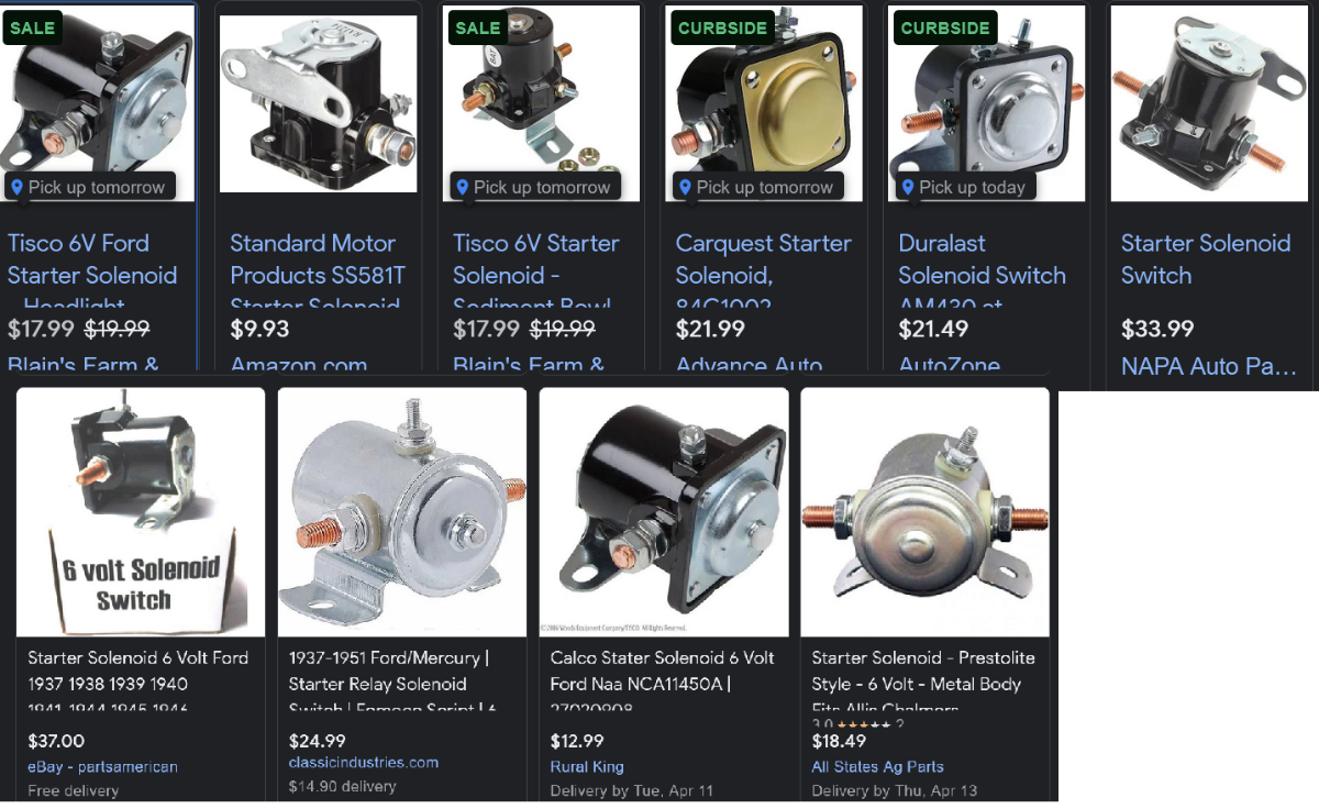 You can bye modern style solenoids 6v or 12v with 3 or 4 poles at any automotive parts outlet. The "Ford" style refers to the 3 pole 6v not really a specific look, but mounting hole positions. https://www.google.com/search?q=6v+star ... V6BQgBENsB