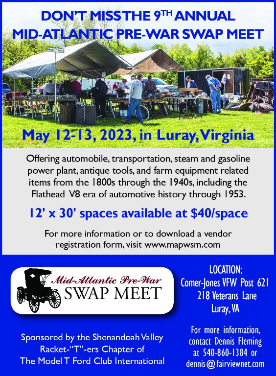 So make plans now to spend May 12th and 13th perusing the swap meet and the 14th through the 16th behind the wheel of your Model T and seeing Virginia the way Henry intended.