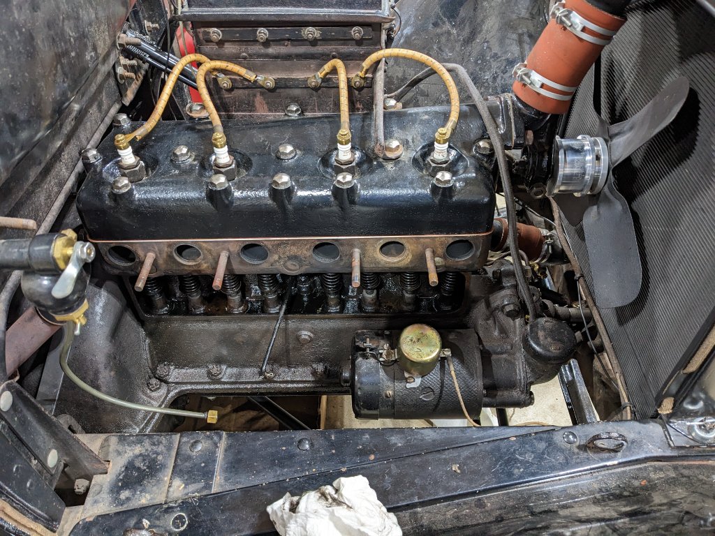 I fired up my 1912 engine that the previous owner had rebuilt. He had passed away and I wound up, ultimately, with the car. He was very fastidious in his restoration. The engine had not been started since rebuild so it took some muscle to crank it, but it fired up using a 6V battery and ran nicely on battery.