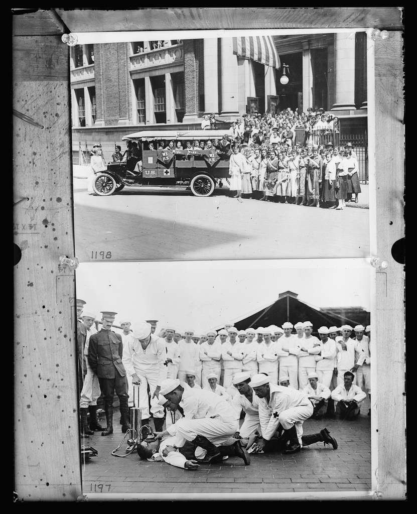 Brooklyn YMCA boys organize hospital unit for work in France. Reviving a "victim" with a pulmotor; Washington Irving High School girls present war ambulance to the Red Cross