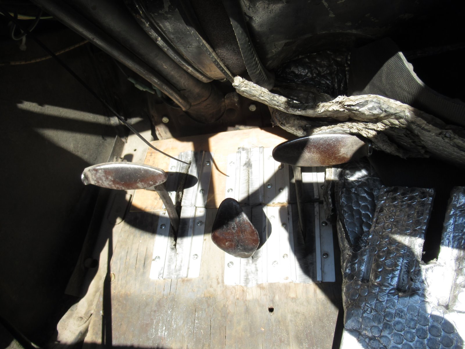Have this set of old aftermarket, 'Crawford' brand, pedal slip covers, these fit over the pedals and have a slit for the pedal shaft to help seal the area of the floorboard slots. The material is old, the burlap backing is flaking, but top side is still supple. And these have button fasteners on the backside, these are ANZO type, so you would need to find the proper male stud with wood screw mount to fit to the floorboard. PM if interested.