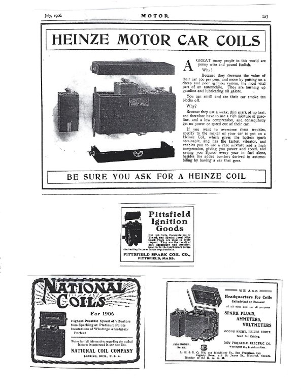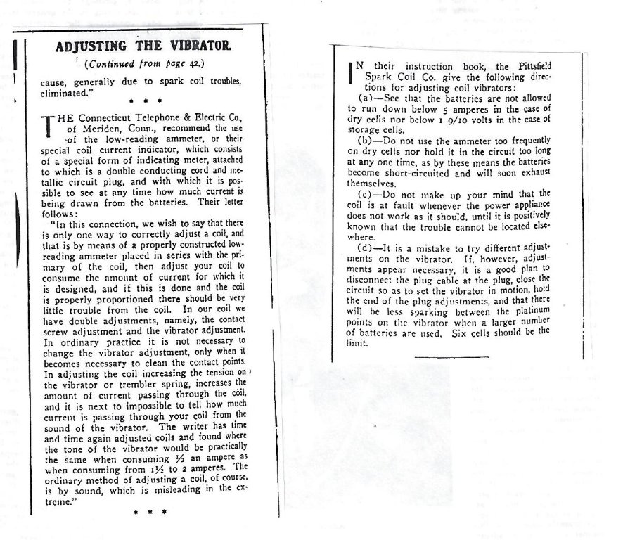 Attached is a 1906 article about coil adjustment from the manufactures of the period, to include Leon Rubay, importer of french trembler or vibrator coils, Dow Portable Electric Company, Dayton Electrical Manufacturing, Connecticut Telephone and Electric, and Pittsfield Spark Coil Company.